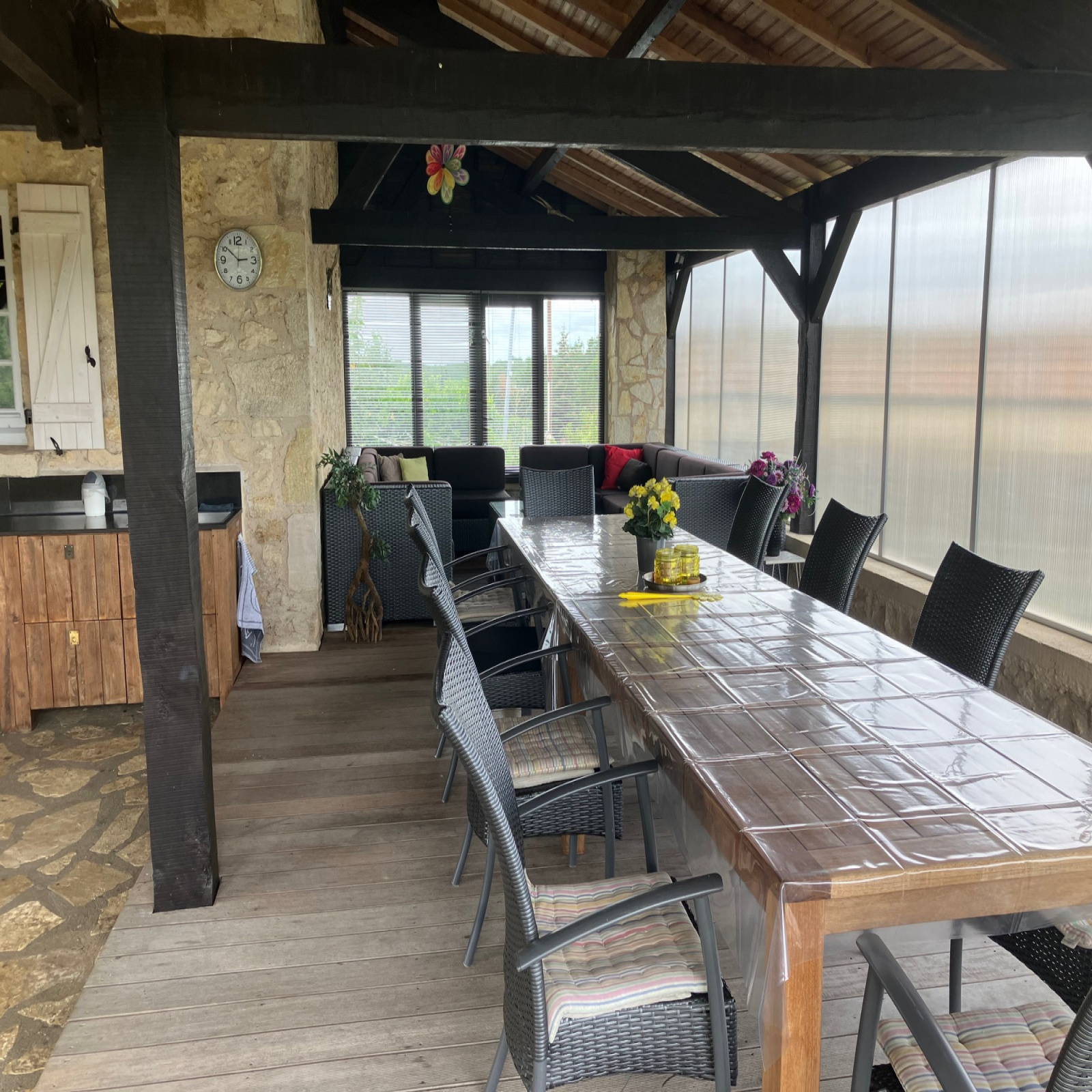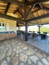 Begane grond: 1 groot terras met stenen bestrating, gedeeltelijk overdekt, met zomerkeuken en uitzicht.