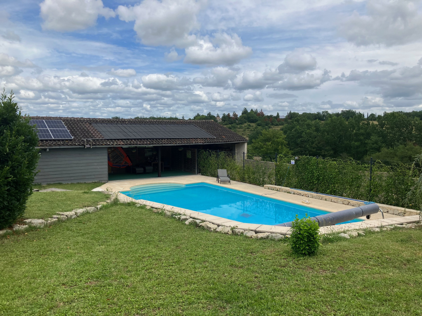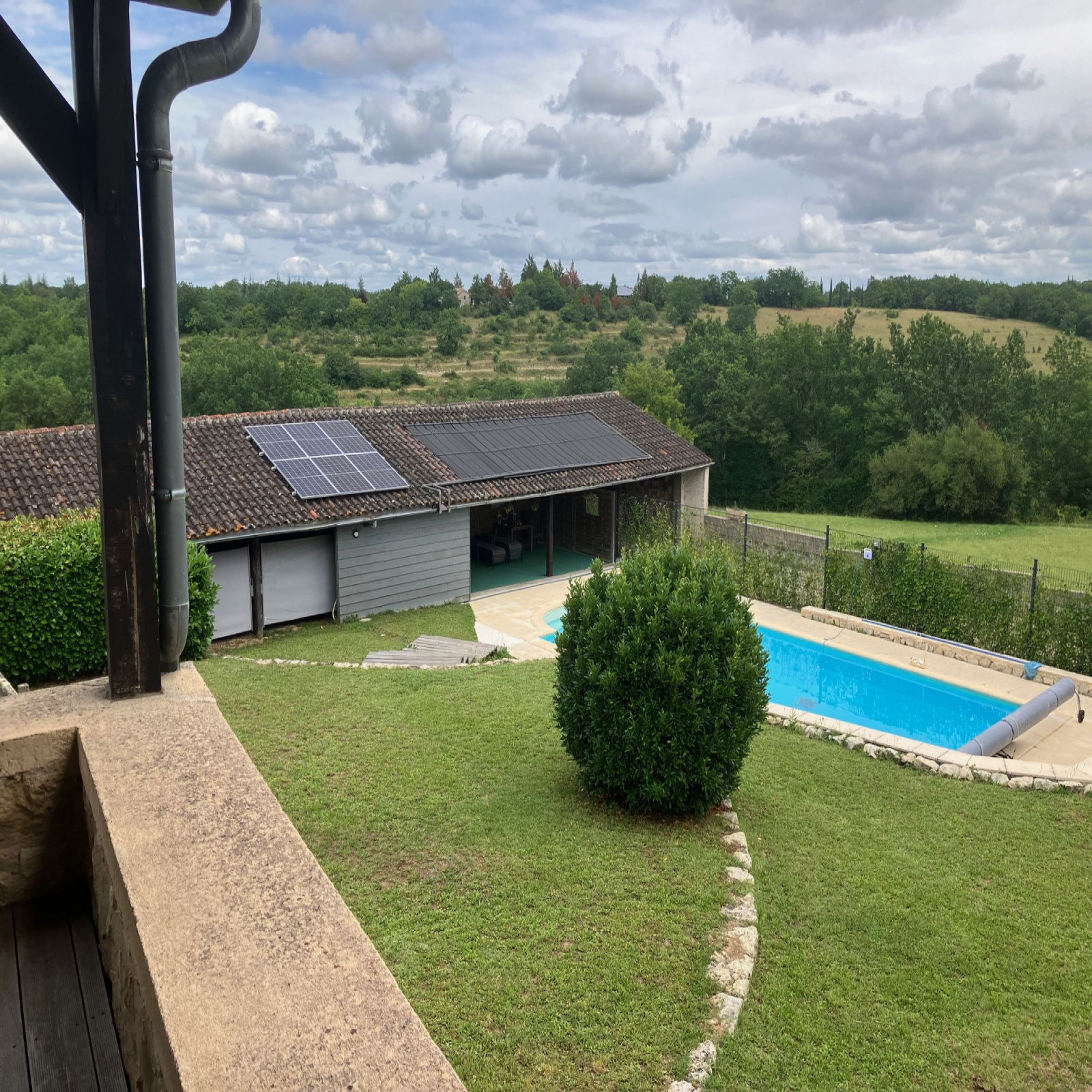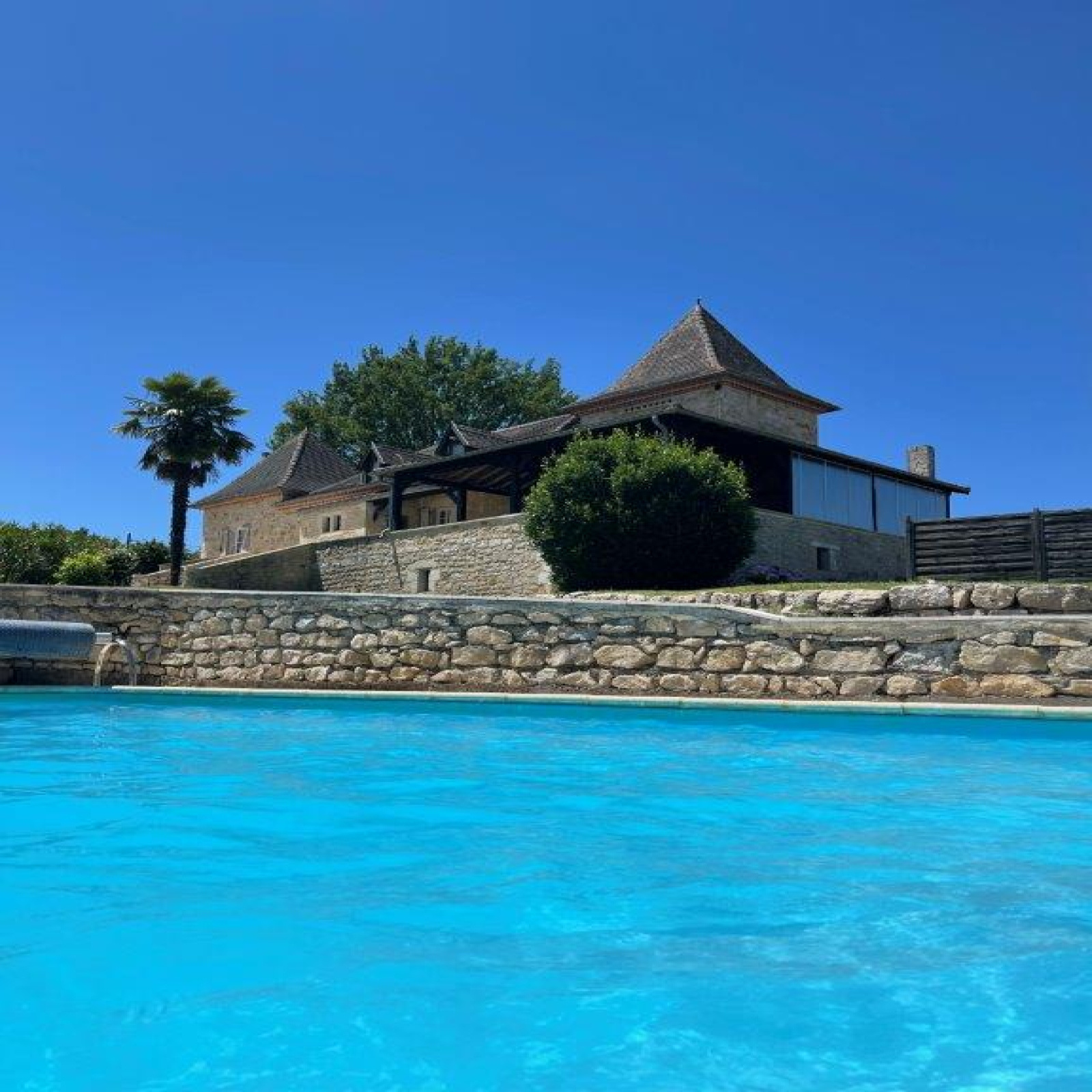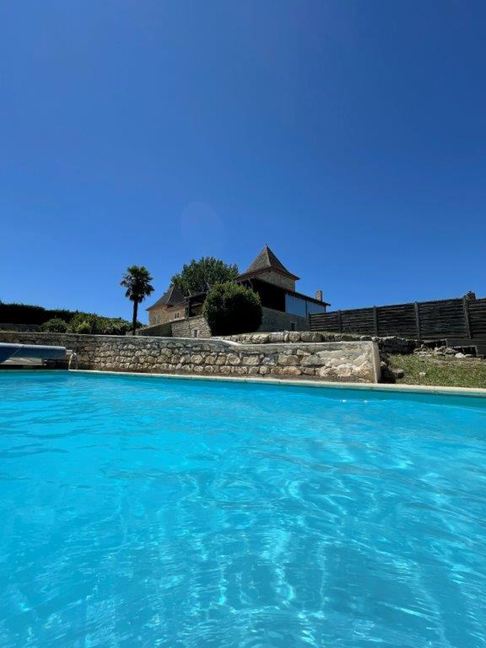 Een 10 x 5 meter groot zoutwaterzwembad, verwarmd door de zon, met een liner, Romeinse trap en betegelde oppervlakken van gereconstrueerde stenen.