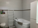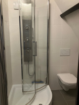 Badkamer van 3,19 m2, douchecabine, wastafel op een meubel, toilet, tegelvloer.