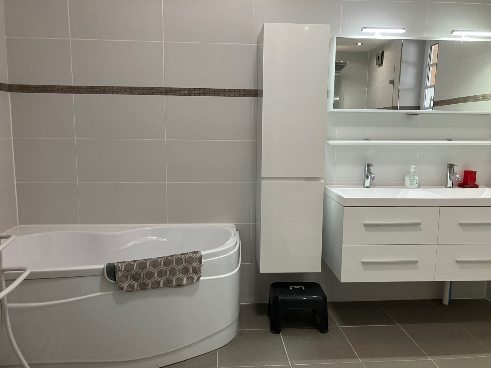 Badkamer van 9,53 m2, ligbad, inloopdouche, 2 wastafels op een meubel, toilet, tegelvloer.