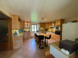 Een keuken van 23,32 m2, boven- en onderkasten, kookeiland, dubbele spoelbak, huishoudelijke apparaten, tegelvloer.