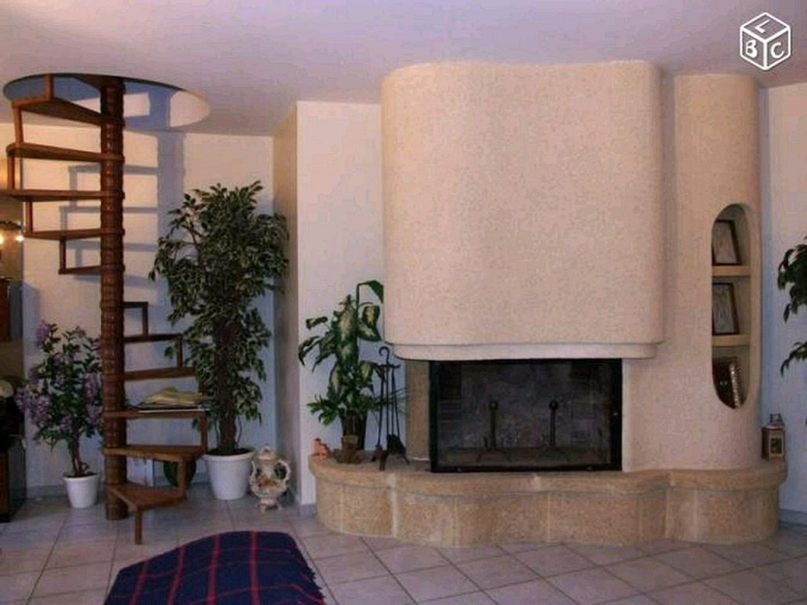Grote woonkamer met gesloten haard, mezzanine en tegelvloer.