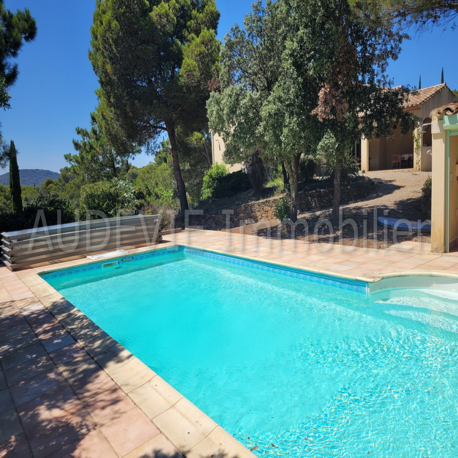 Gelegen op een privéterrein van 3.800 m² met een oppervlakte van 3.800 m², een villa met een oppervlakte van 9x4 slaapkamers en een poolhouse, een mediterrane tuin met laurierbomen, bloemen, groene bomen, palmbladeren en meer privacy op een spectaculaire manier. panoramisch uitzicht over Corbières en de omliggende gebieden.