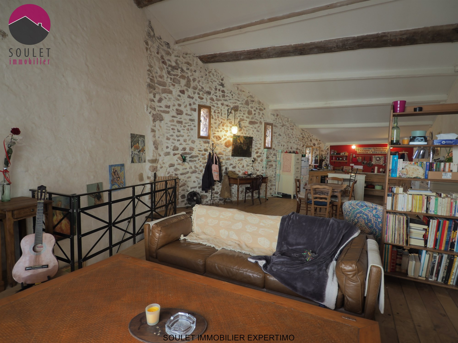 Op de bovenverdieping bevindt zich de woonkamer van bijna 65 m² met een verrassend volume onder het schuine dakframe.