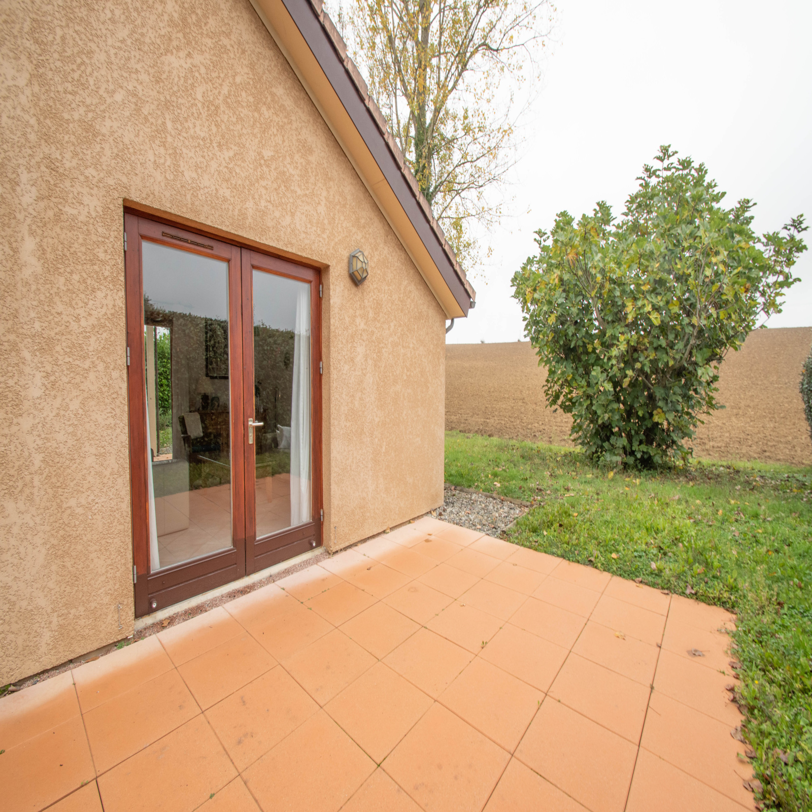 Bebost terrein met gazon , vijgenboom en geen inkijk .